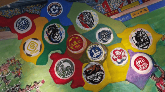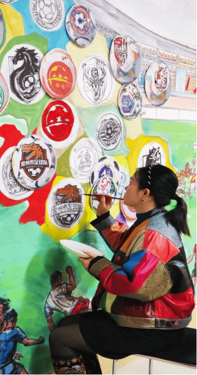尤为特别的是,前中国国家男子足球队主教练米卢的身影出现在画中 —— 他以常州球迷的身份观赛,既是对江苏足球热度的认可,也为作品增添了跨地域的文旅记忆点。而画作的 “地理与团队符号” 同样清晰:江苏省 13 个球队的队标错落排布,与背景中的江苏省地图交相辉映,既点明了赛事的 “城市联动” 属性,也让江苏各城市的文旅风采在笔墨中实现了 “集体亮相”。