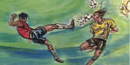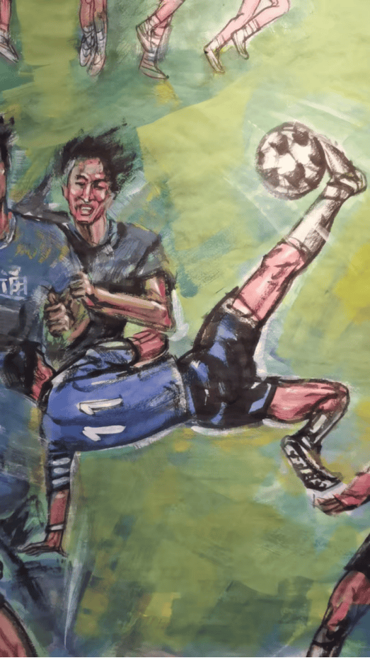 其一,是传统艺术与现代体育的破壁联动。国画作为中国传统艺术的核心载体,历来多表现山水、花鸟、历史人物,而这幅作品却将视角对准 “足球联赛” 这一充满现代活力的竞技场景:用毛笔勾勒射门的弧线,用墨色渲染赛场的激情,既打破了传统国画的题材边界,也让足球运动的 “速度与力量” 通过传统笔墨得到独特诠释,为两种文化形态找到了共鸣点。