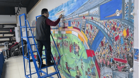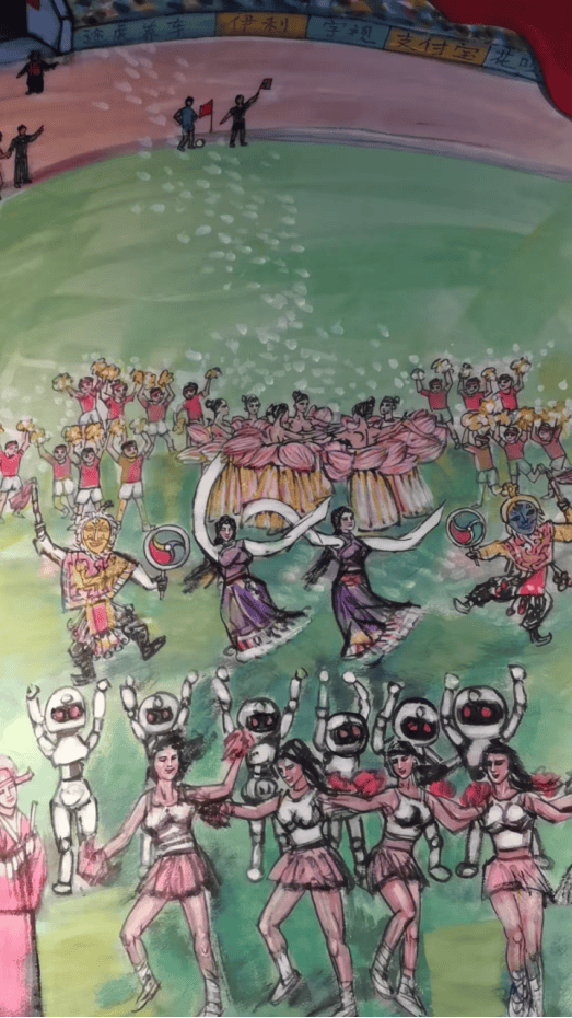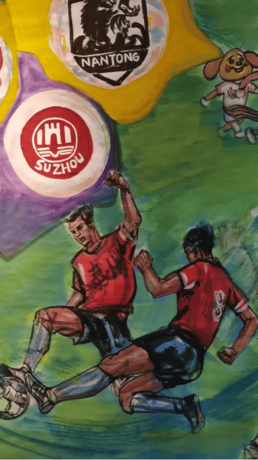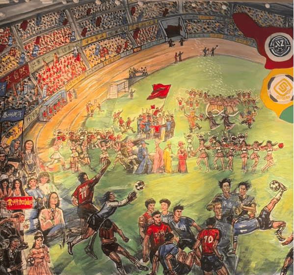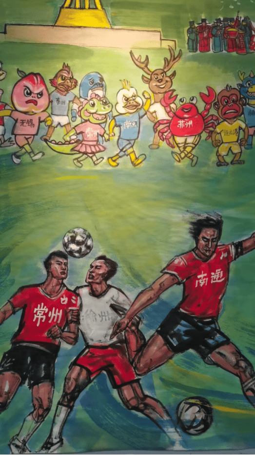 这幅国画打破了传统书画对静态场景的呈现惯性,以灵动的线条勾勒赛场张力,用浓淡相宜的墨色晕染激情氛围,更以饱满鲜活的色彩点亮细节,将江苏省城市足球联赛的 “活态场景” 完整搬进宣纸 —— 从憨态可掬的吉祥物到热情澎湃的球迷,从震撼人心的赛事高光到默契十足的团队互动,每一处笔墨都牵着赛场的温度,每一个形象都载着江苏的文旅精神。