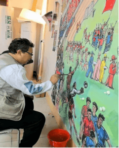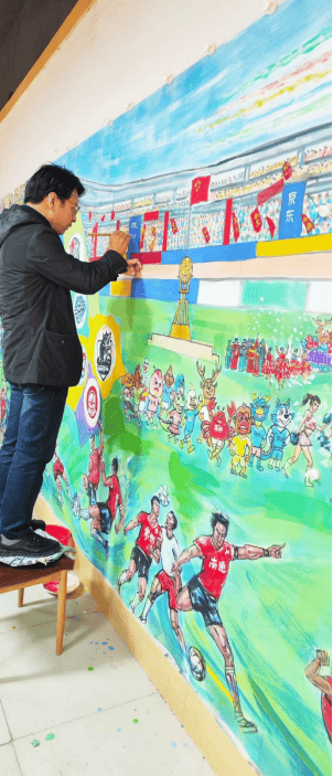 桑一田,号 “马语者”“人面兽心斋主”,中国当代著名画家,现任中国书画院副院长、北京智慧科学研究院一一客座教授、创作委员会主任。他自幼专攻画马、画狼,作品以阳刚大气、饱含生命张力著称,既承徐悲鸿奔马的神韵,又融入个人创新风格。其艺术成就早已跨越国界:作品被国家政协礼堂、神六航天组、2008 北京奥组委收藏,曾参与 “神系云南” 巨屏创作、昆明新机场 3×30 米巨幅壁画绘制,更曾为第 66 届联合国大会创作 “多彩中华” 长卷,纪录片登陆纽约时报广场纳斯达克大屏。此次主笔人物,桑一田以利落的线条勾勒球员的拼搏姿态、球迷的热情神情,将足球运动的动感与力量感融入笔墨,让每一个人物都兼具 “形” 的生动与 “神” 的鲜活,完美诠释了 “体育之美” 与 “艺术之美” 的交融。