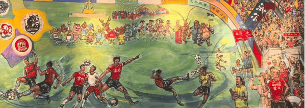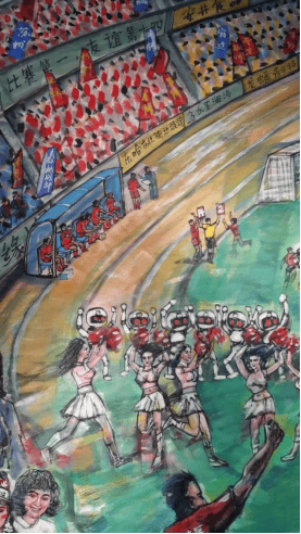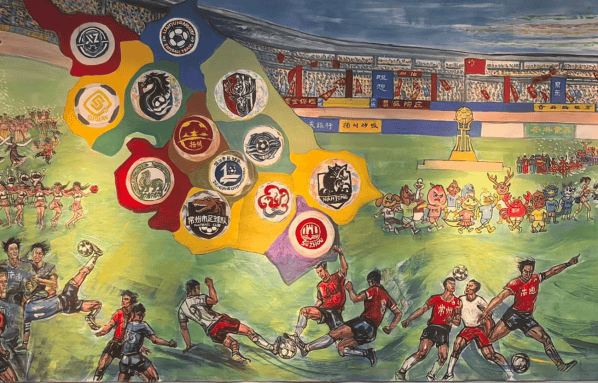 其二,是江苏城市精神与文体精神的集中彰显。画作中 13 支球队的队标与江苏省地图呼应,展现了江苏 “十三市联动” 的文体格局;泰州 11 号的倒挂金钩、镇江 47 号的英勇挡球,刻画的是 “拼搏不服输” 的文体精神;米卢观赛、球迷助威的场景,则传递出江苏对足球运动的热爱与包容。这些元素共同勾勒出江苏 “崇文尚武” 的城市气质,让画作成为展现江苏地域文化的 “视觉名片”。
