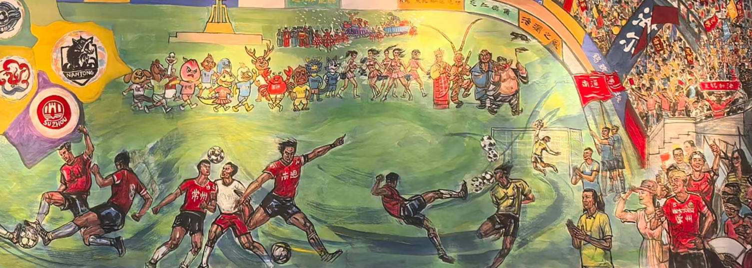 当江苏省城市足球联赛的绿茵激情在赛场绽放,一场跨越传统艺术与现代文旅的创作也悄然酝酿。近日,以赛事为核心的大型主题国画《江苏省城市足球联赛》正式落成,尺寸为 2.5 米 ×9 米,这幅作品由著名书画家朱文总策划布局设计,知名画家桑一田主笔人物创作,中国书法家协会会员邓凌鹰、黄石、陈吉安 联袂担当书法题字,以笔墨为媒,将江苏足球的热血瞬间与城市风采定格成永恒的艺术篇章。